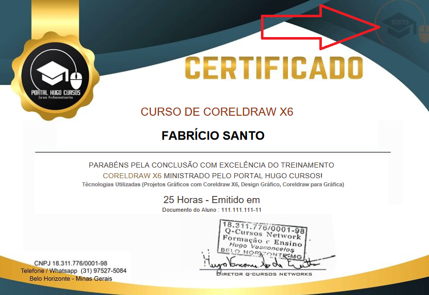 O código será apresentado no canto superior direito do certificado, um número dentro de uma marca d'agua, conforme mostrado na imagem ao lado, basta inserir aqui este número ou usar a url https://facu.valenview.com.br/certificado/codigo.